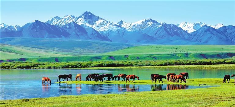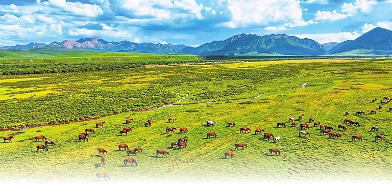 白雪皚皚的祁連山下,一眼望不到邊的大片牧草青翠碧綠,色彩斑斕的野花競(jìng)相開放,擁有百萬畝草原的山丹馬場(chǎng)如巨幅彩色畫卷徐徐展開。