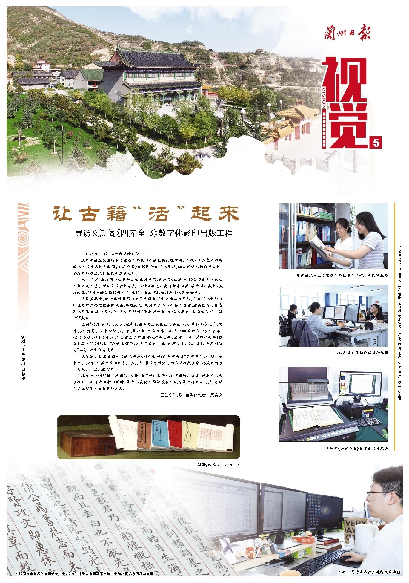 在讀者出版集團(tuán)所屬古籍?dāng)?shù)字科技中心的數(shù)據(jù)處理室內(nèi),工作人員正在緊鑼密鼓地對(duì)采集來(lái)的文溯閣《四庫(kù)全書(shū)》數(shù)據(jù)進(jìn)行數(shù)字化處理,加工成標(biāo)準(zhǔn)的數(shù)字文件,供后續(xù)影印出版和數(shù)據(jù)庫(kù)建設(shè)之用。