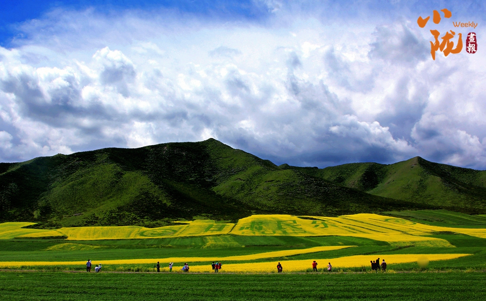 遠處,山巒高低起伏;近處,黃綠相間。金黃的油菜花和藍天、雪山、白云融合在一起,組成了別致的夏日美景,充滿了西部特有的浪漫色彩。