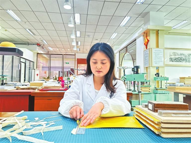 今年23歲的羅雪瑞是保護中心里的古籍修復師。她告訴記者:“在學校時學的是工藝美術品設計專業(yè)書畫裝裱方向,需要很強的動手能力,這為古籍修復工作打下了很好的基礎。”