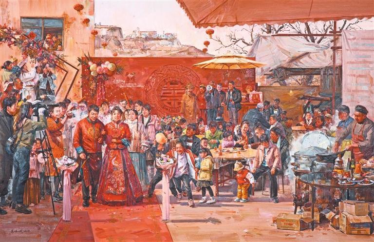 《成紀二月喜盈門》描繪了秦安一對新人舉辦婚禮的場景。身著傳統(tǒng)服飾的新人,在親朋好友祝福中朝觀眾走來。靜心觀察,會發(fā)現(xiàn)每個人都充滿鮮明的角色感,樸拙的外表、內(nèi)蘊的情感、濃厚的民俗、歡樂的場景,共同交織成一方地域上的斑斕畫卷。