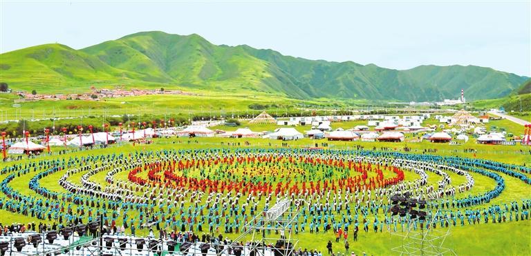 壯觀的萬人鍋莊舞展演在碌曲縣夏澤灘草原上演。新甘肅·甘肅日報記者 馬伊星