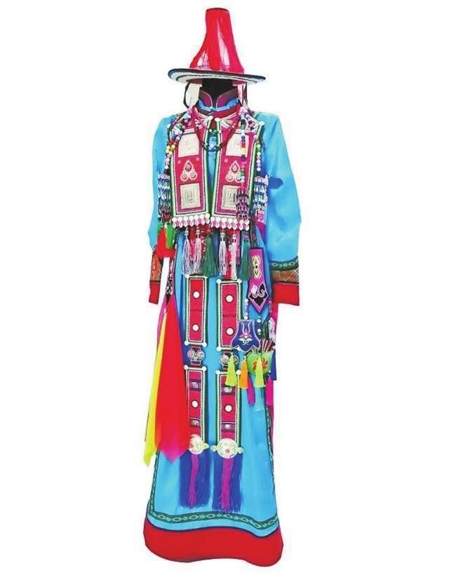 女性婚服是最隆重的,很多婚后日常服裝也在此時備好。女性婚服中最具辨識度的是頭面,長條形頭面佩戴在女子的三條長辮子上,胸前兩條,背后一條。多見布制的頭面,綴上珊瑚、綠松石、瑪瑙等,也有用紅牛皮底、黑或紅色絲絨底的頭面,鑲上銀牌、蜜蠟、珊瑚、松石等飾物,背后的一條頭面下方垂一顆紅珊瑚,上面鑲23塊白色海螺磨制的圓片,這種傳統(tǒng)頭面總重量約在五到七斤左右。傳統(tǒng)女性婚服多用藍(lán)色和綠色,以區(qū)別于著紅色服裝的“點格爾汗”天神。隨著文化的交流變化,對服裝色彩的禁忌逐漸消解,黃色、米黃色、紅色等色彩也常被新娘穿戴。