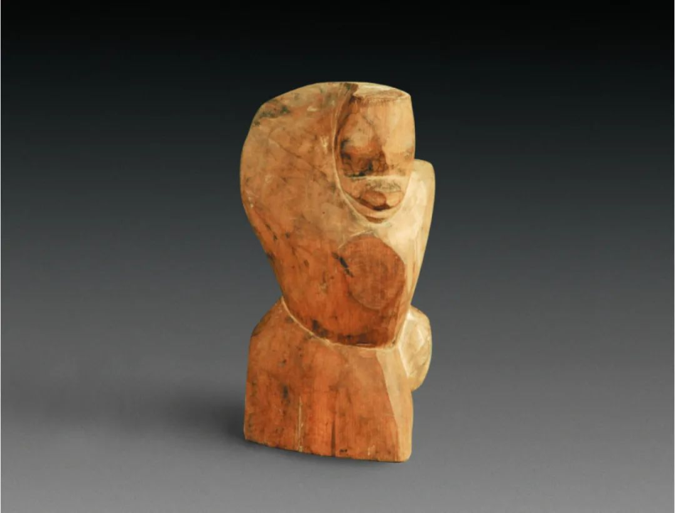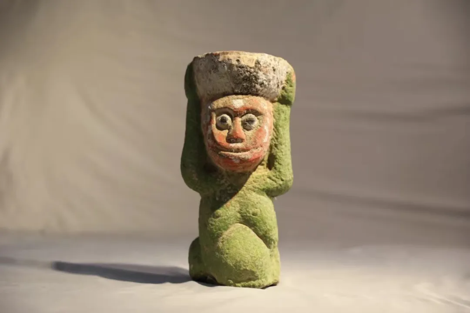 彩繪木猴,漢代,一級文物。武威市磨嘴子漢墓出土。寬 17.3 厘米,高 32.5 厘米。木質(zhì),由整木削制而成,全身施黑、白、紅三彩,木猴呈蜷縮、蹲臥狀,刀法簡潔質(zhì)樸,充滿藝術(shù)感。