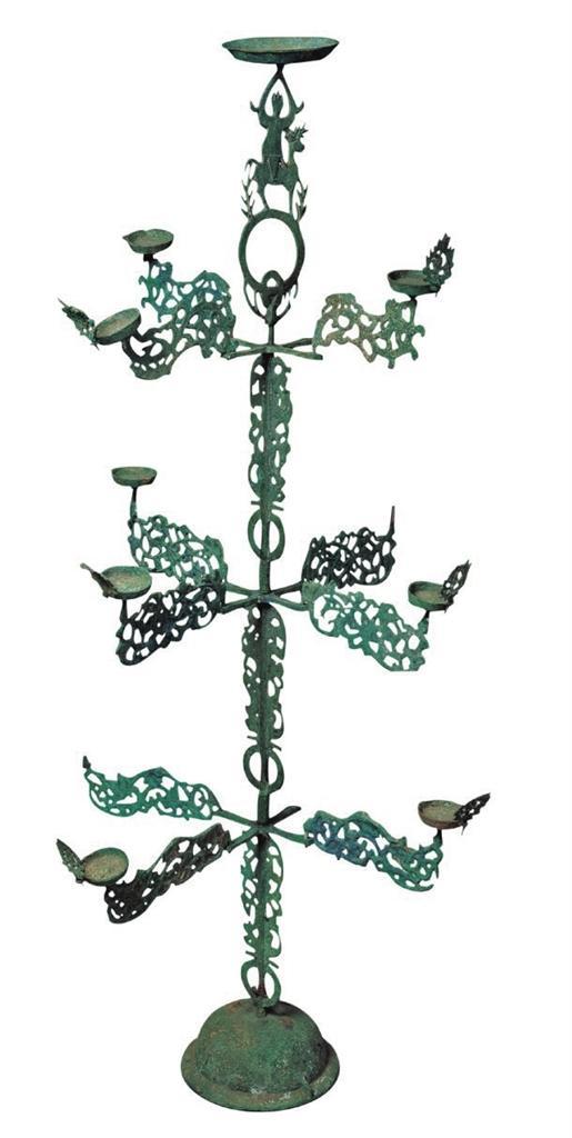▲1969年出土于武威市雷臺漢墓。燈呈樹形,由燈盞、葉、干枝和座等部分組成。燈座為覆缽狀,飾瑞獸紋和云氣紋。燈的主干為三段套插而成,每段均飾有連環(huán)和鏤空葉片,段與段銜接處各有一個十字形托架。十字托橫向四出,四端各飾透雕花葉一個, 每層花葉紋飾各不相同,葉端承托小燈盞一只,燈盞外沿各有桃形葉飾一個,象征火焰。主干頂端為鏤雕仙人騎鹿形花飾,仙人雙臂高舉托一大燈盞。原有燈13盞,現存9盞。