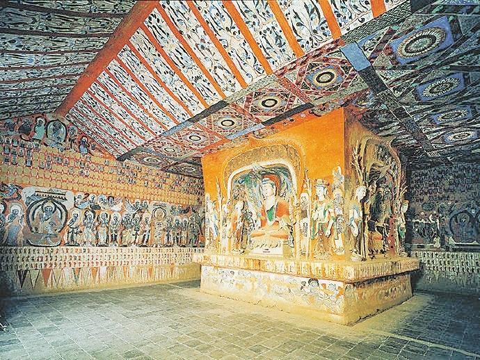 另一個創(chuàng)新改良的洞窟建筑是中心塔柱窟,其原型是印度支提窟。洞窟平面多呈倒U形;窟內(nèi)空間多被兩列石柱縱向分成三部分,中間是主室,既寬又高,兩邊是側(cè)廊,較低而且比較窄;主室前端是入口,后端是半圓形后室;后室中央雕鑿佛塔,兩側(cè)石柱在佛塔后部相接;主室的頂部為縱向肋骨筒拱,側(cè)廊頂部為半圓扇形。這樣佛教徒就可以經(jīng)過側(cè)廊進行繞塔禮拜。在莫高窟北朝第二期洞窟里,中心塔柱才開始大量出現(xiàn),并一直興盛到初唐。