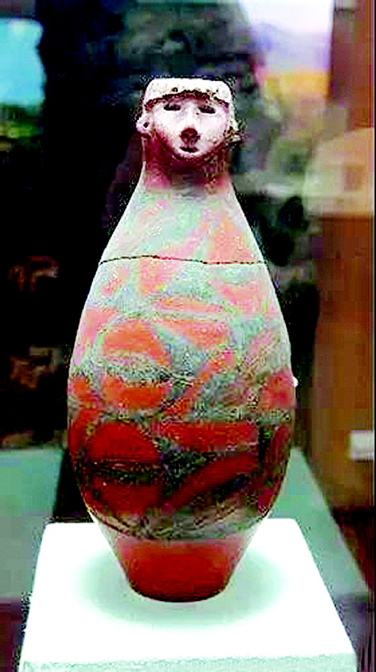這件距今約6000年的文物,高31.8厘米,口徑4.5厘米,底徑6.8厘米,被許多人稱之為半神半人彩陶瓶。瓶為細(xì)泥紅陶質(zhì)地,腹部以上施陶衣。器型為兩頭尖的圓柱體,下腹內(nèi)收。瓶器口為圓雕人頭像,披發(fā),堪稱遠(yuǎn)古時期的雕塑杰作。