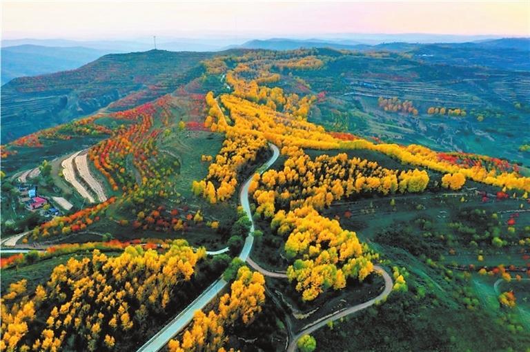 金秋時(shí)節(jié),這里秋葉五彩繽紛,黃得如金,綠得如玉,紅得如火,把秋姑娘打扮得格外妖嬈。一陣涼風(fēng)拂過,金黃的樹葉,搖曳著一把把小扇子,從空中飄飄而下,似乎在訴說著一個(gè)美麗的童話。村落散落在綿延數(shù)里的山腳下,村前屋后金色圍繞,梯田如鏈似帶、穿插交錯(cuò),如一幅幅線條簡(jiǎn)潔明快的木刻版畫。