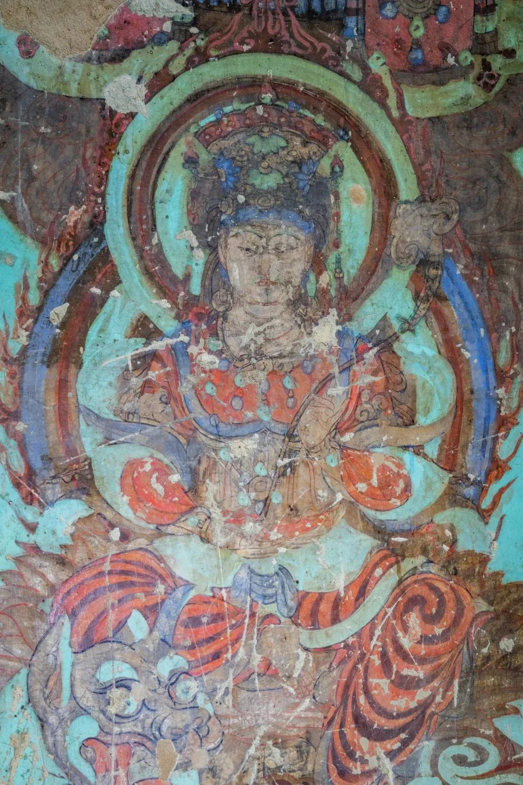 現(xiàn)在第4窟中早期塑像多數(shù)已毀,但仍殘存少數(shù)幾身,十分珍貴;各側(cè)面表層為西夏重修時(shí)繪制的壁畫;柱座與柱身的兩層自下而上逐層縮??;中心柱正面在西夏時(shí)改造成一橢圓形的大背屏,背屏正面表層為清代重繪的壁畫;四壁及頂上壁畫也多為西夏時(shí)期。