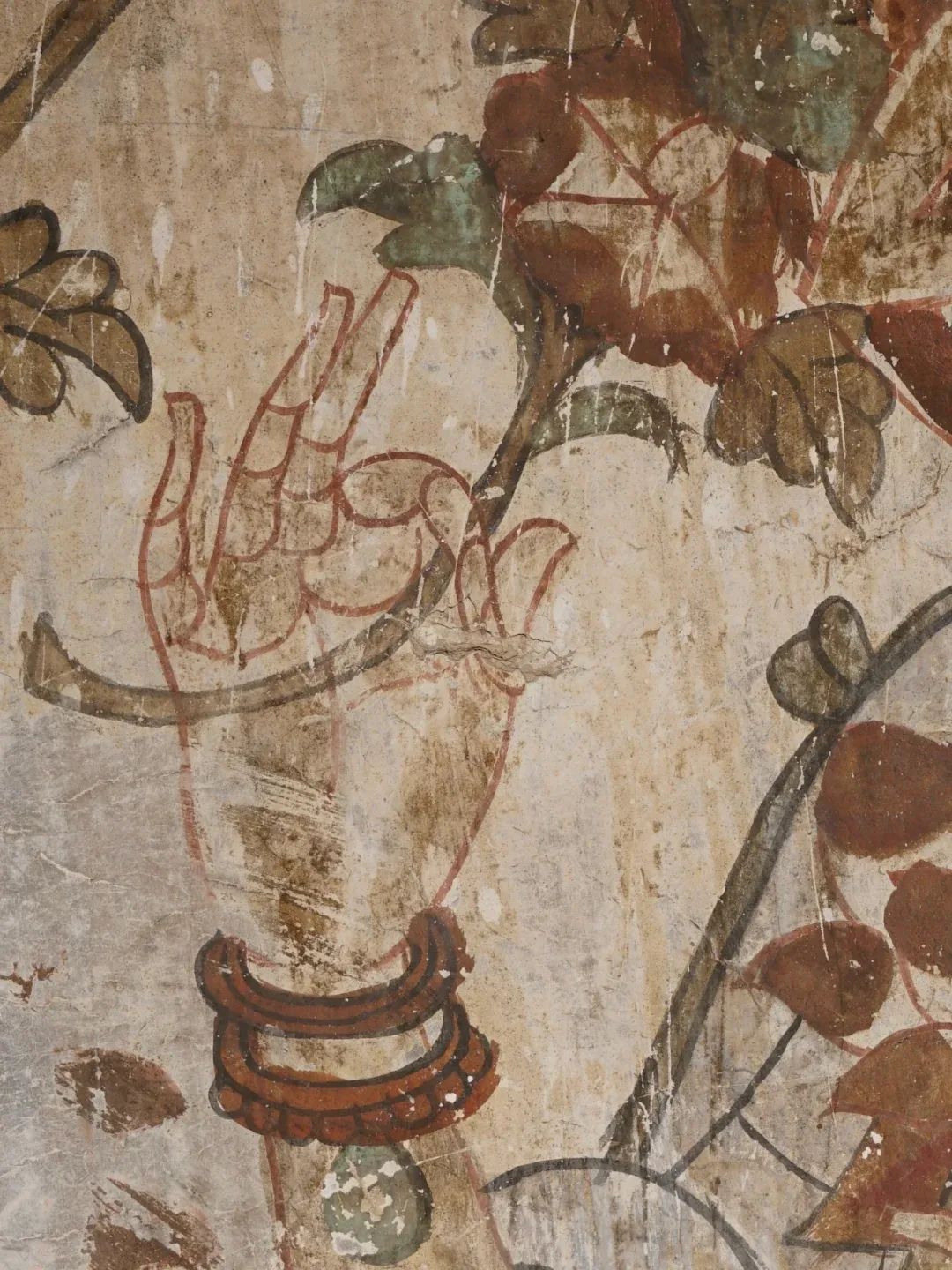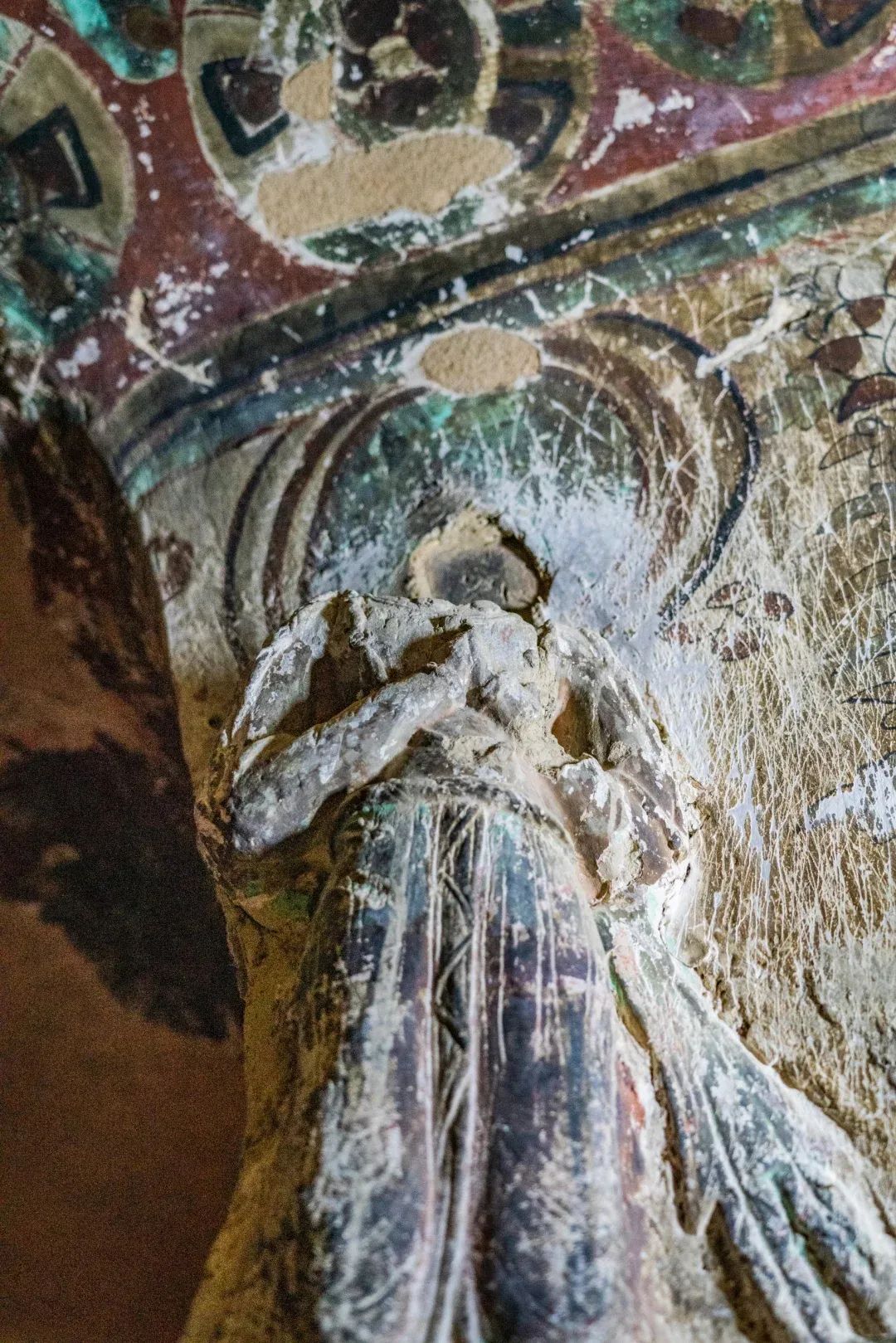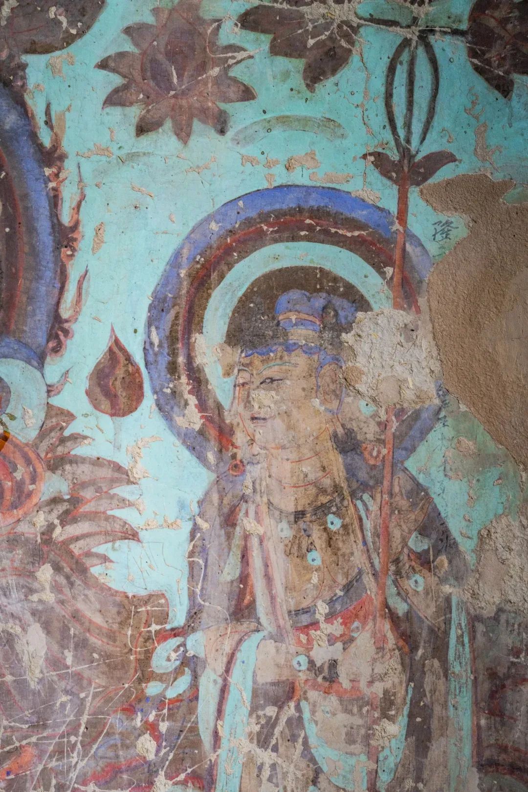 昌馬石窟第4窟洞窟形制及其殘存的塑像對(duì)于研究中國(guó)早期石窟藝術(shù)與佛教造像藝術(shù)極其重要??邇?nèi)壁畫內(nèi)容是四壁上方畫條式旌幡,下畫供養(yǎng)菩薩,身高近2米,今殘存20身,菩薩周圍畫纏枝蓮,與第二窟基本相同。窟頂前半部地仗大部分脫落,靠近中心柱正面上部右側(cè)的部位殘存龜形六瓣團(tuán)花圖案與一身飛天及菊花紋圖案。后部中心柱頂部周圍窟頂表面繪龜形六瓣團(tuán)花、連珠紋等圖案。