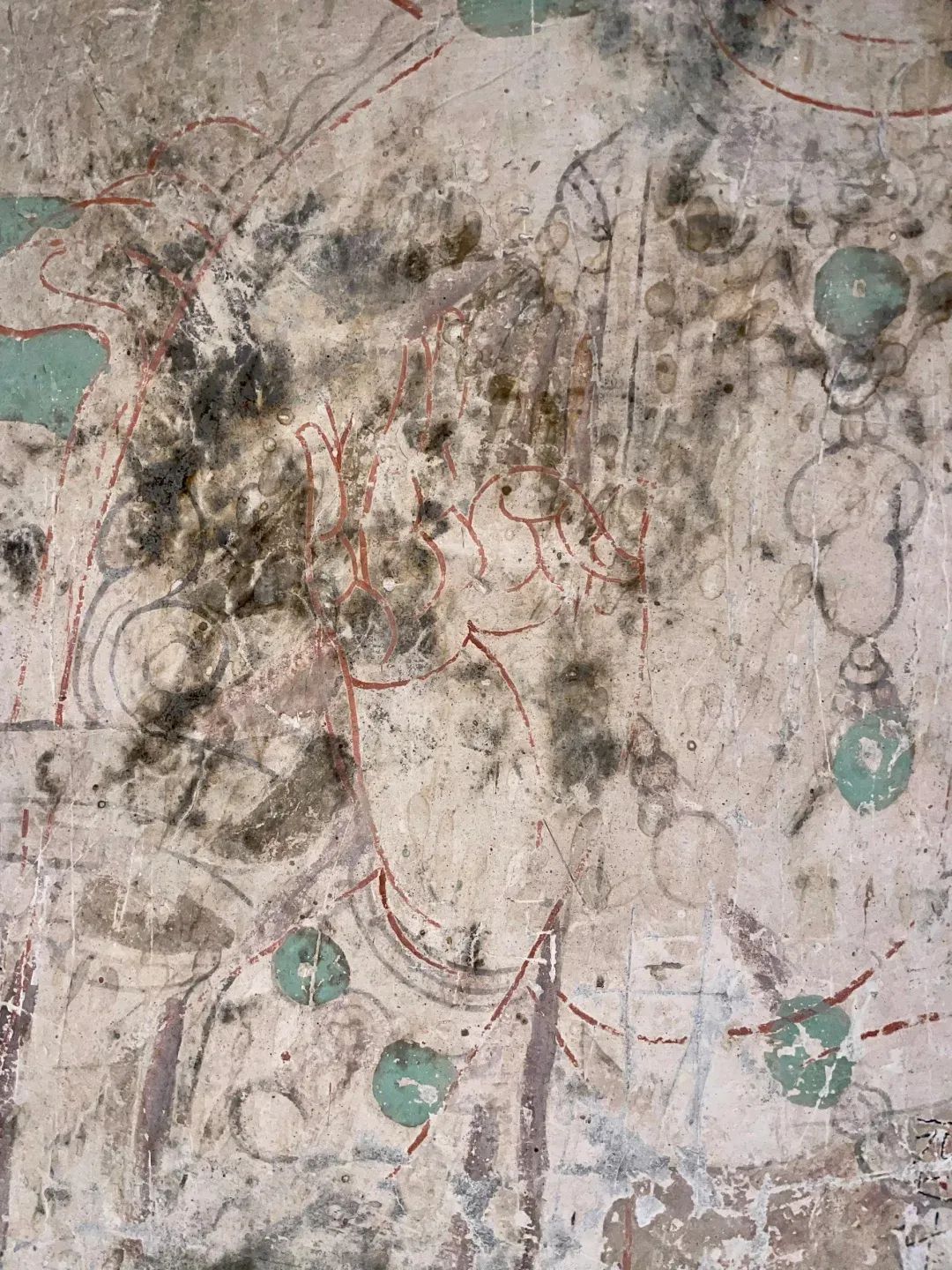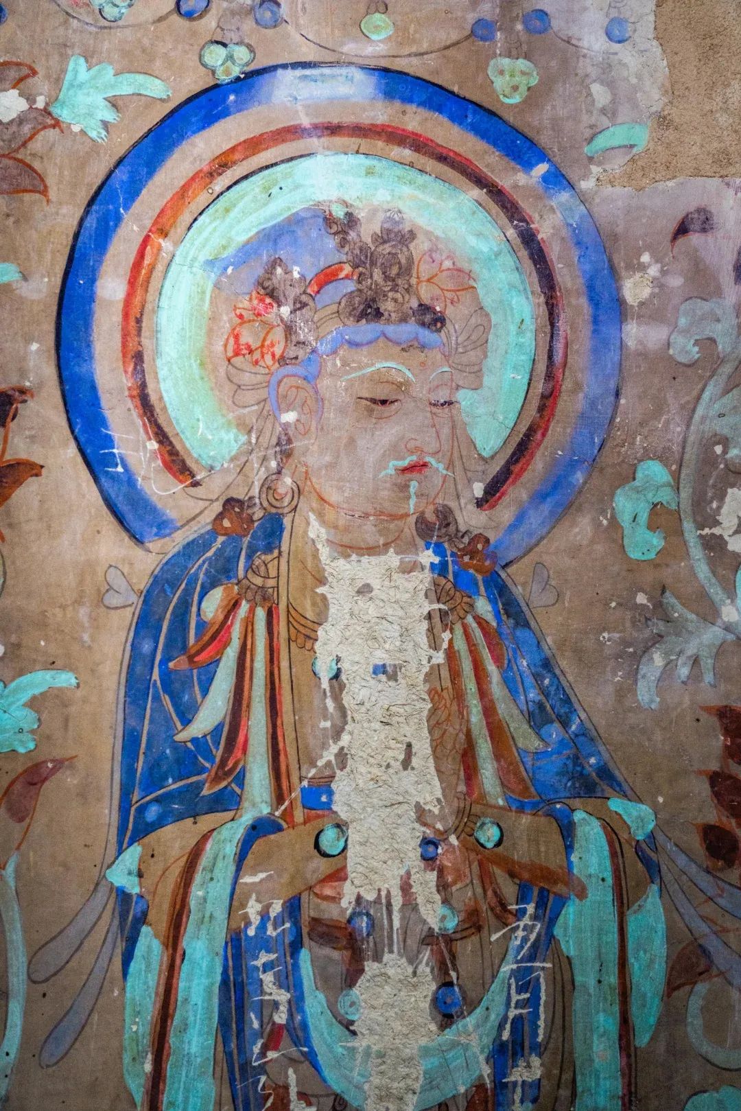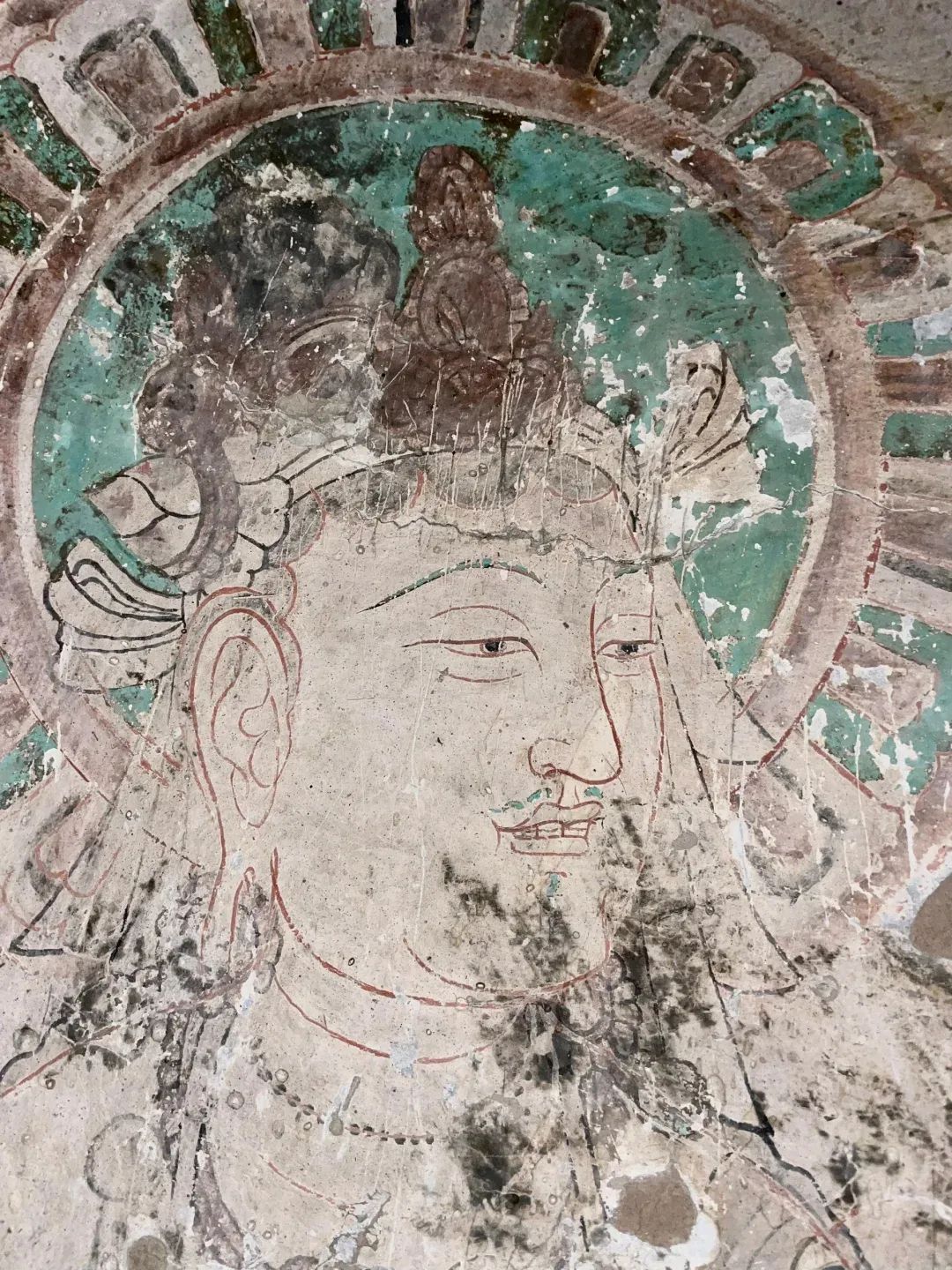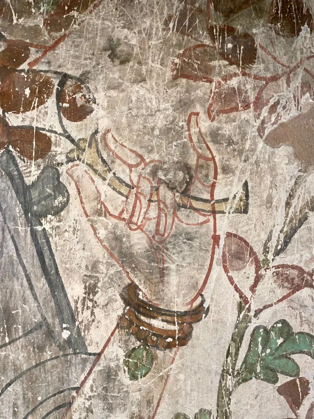 昌馬石窟第4窟洞窟形制及其殘存的塑像對(duì)于研究中國(guó)早期石窟藝術(shù)與佛教造像藝術(shù)極其重要??邇?nèi)壁畫內(nèi)容是四壁上方畫條式旌幡,下畫供養(yǎng)菩薩,身高近2米,今殘存20身,菩薩周圍畫纏枝蓮,與第二窟基本相同。窟頂前半部地仗大部分脫落,靠近中心柱正面上部右側(cè)的部位殘存龜形六瓣團(tuán)花圖案與一身飛天及菊花紋圖案。后部中心柱頂部周圍窟頂表面繪龜形六瓣團(tuán)花、連珠紋等圖案。