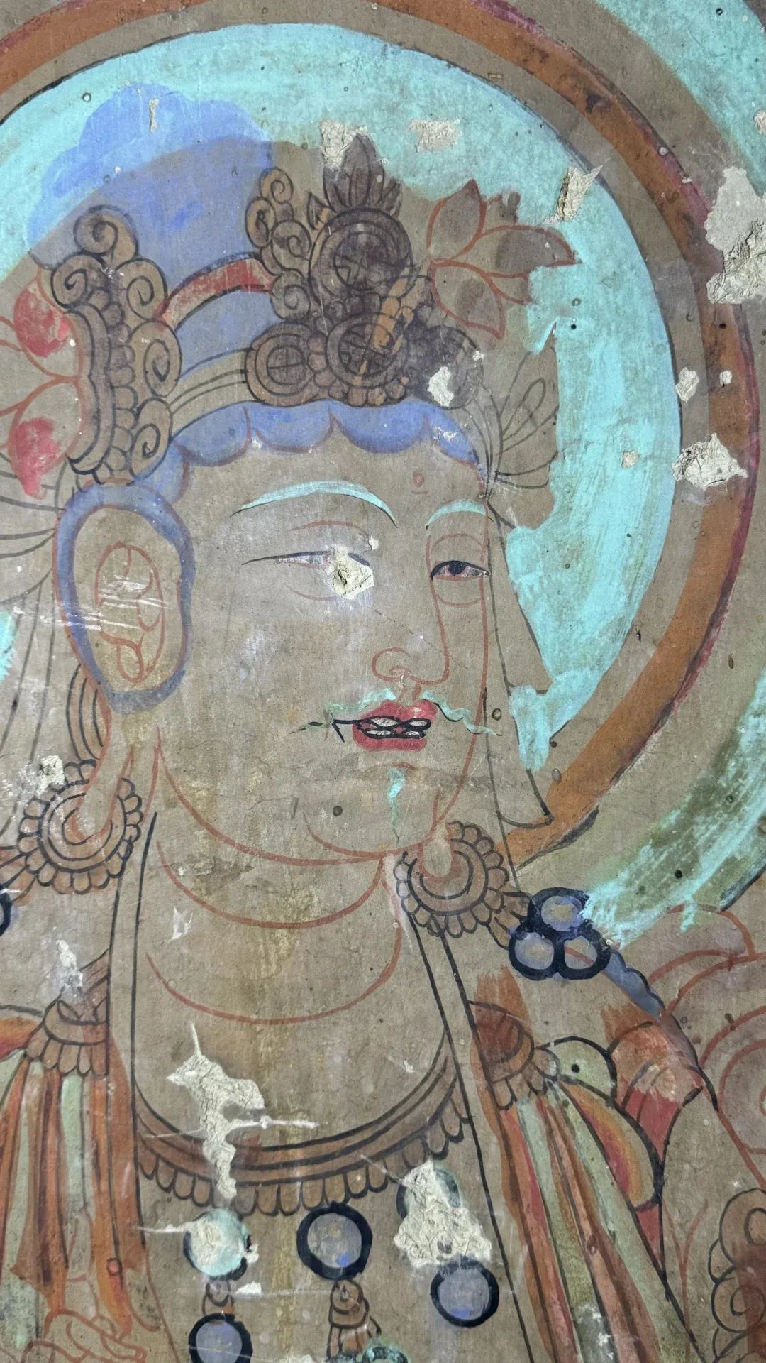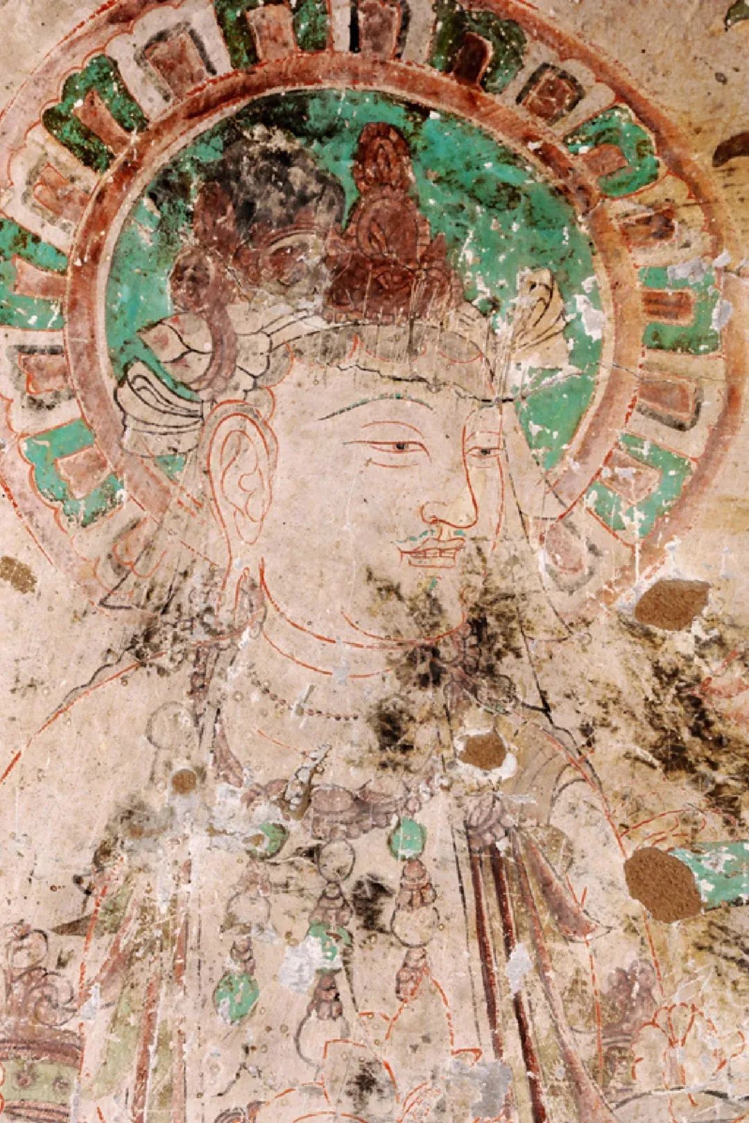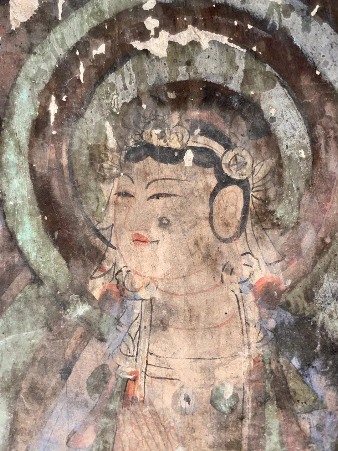 昌馬石窟第1、2、4窟表層西夏時(shí)期所繪壁畫的內(nèi)容,用色及菩薩的服裝等極接近敦煌莫高窟第328、327窟和榆林窟第17窟西夏壁畫。其用筆比較端莊拘謹(jǐn),不似唐代自由流暢;用色以赭紅、大綠為主;人物造像尤其是菩薩形象程式化,菩薩衣飾華麗復(fù)雜,但神態(tài)略顯呆板,不似唐代優(yōu)美生動(dòng)和神采煥發(fā);裝飾圖案繁縟化,這些都與敦煌莫高窟、瓜州榆林窟、肅北五個(gè)廟同時(shí)期的壁畫具有統(tǒng)一的時(shí)代風(fēng)格。