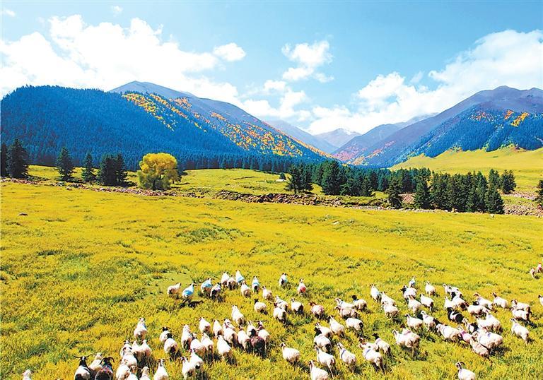 走進(jìn)景區(qū),映入眼簾的便是布爾智峽谷,其重巒疊嶂,造型奇特。進(jìn)入峽谷,豁然中開(kāi),地勢(shì)平坦,視野開(kāi)闊,形成五山匯集的盆地景觀,一條悠悠的小河穿過(guò)盆地的胸膛,明亮清澈。遠(yuǎn)山白雪皚皚,山腰云杉參天,山下灌木叢生,蒼翠蔥郁,山底蒼蒼茫茫的草原上,不時(shí)涌動(dòng)著潔白的羊群。徜徉于廣袤的草原,便真正體味到“鳥(niǎo)的世界,花的海洋”的博大內(nèi)涵。