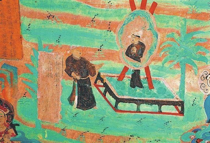 戰(zhàn)國時期楚國詩人屈原在《漁父》一文中寫道:“吾聞之,新沐者必彈冠,新浴者必振衣。安能以身之察察,受物之汶汶者乎?”意思是說我聽說剛洗過頭的人一定會去彈彈帽子上的灰塵;剛洗過澡的人一定要抖抖衣服的灰塵。怎能讓清白的身體去接觸世俗塵埃的污染呢?當(dāng)年的敦煌人走出溫泉,在身心放松之后,就該靜觀返照自己了。在莫高窟第85窟中有一幅“曲花式鏡圖”:畫面上在一個正方形鏤空的底座上擺放著一個巨大的曲花式鏡,鏡子式樣別致,明亮澄澈。藍色的曲花式樣引人矚目。但畫面上最吸睛的是一位魁梧俊朗身著一襲赭色長袍的男子,他正在鏡子前仔細(xì)地打量自己,而鏡中映射出他神情凝重的情態(tài)來。原來,古人照鏡除了正衣冠之外,還有反觀自照的含義,在鏡子前良久地注視自己,就是對自己反省、頓悟的過程。“一年好景君須記”,走過四季,到了歲末,該是每個人回望來時路,展望前方的時候了。