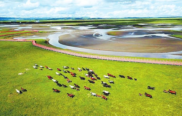 初到河曲馬場,你一定會被眼前的景色所深深震撼。草原空明幽邃,一望無際,馬場攔河大壩內水天一色,碧波蕩漾,朵朵白云倒映在湖水之中,一切美得剛剛好。在一望無際的沼澤水域之中,成群的馬匹自由馳騁在這片廣袤的草原濕地上,各種珍稀動植物在這里共處,湖水環(huán)繞著草原,草原擁抱著湖水,美不勝收。