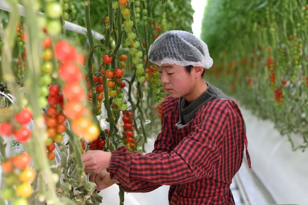 在古浪縣黃花灘生態(tài)移民區(qū)富民新村現(xiàn)代化智能玻璃溫室,村民在管護番茄 范培珅 攝