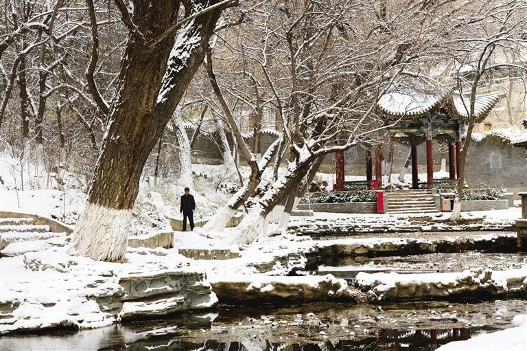 11月25日,雪后的蘭州五泉山公園銀裝素裹,迷人雪景如畫。古老亭臺樓閣紅墻玉頂、參天古樹玉樹瓊枝,宛如大地書寫的一幅“水墨丹青”,美不勝收,游客紛至沓來,賞雪、拍照,盡情享受清爽的空氣和潔白的美景。 奔流新聞·蘭州晨報記者 裴強 攝