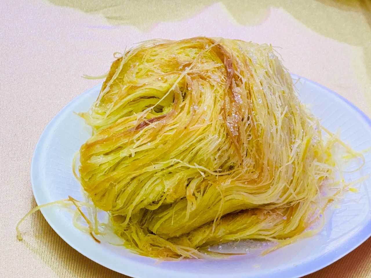 一窩絲的制作是一門精細(xì)的藝術(shù)。面粉、水、鹽和油巧妙混合,揉成光滑面團(tuán)后,反復(fù)地拉伸、對折,直至那面團(tuán)細(xì)如發(fā)絲,再盤成一團(tuán)放入烤箱中,逐漸變得金黃酥脆。吃起來,那口感是層層疊疊的酥,帶著淡淡的油香,每一根絲在齒間斷裂,釋放出獨(dú)特的風(fēng)味。