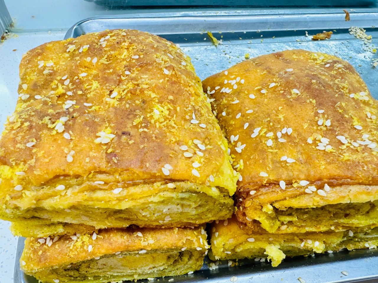 鍋盔則彰顯著力量與耐心。面團(tuán)經(jīng)過反復(fù)多次大力地揉壓,直到堅(jiān)韌而有彈性。接著,將面團(tuán)搟成大大的圓餅,厚度可觀。在特制的爐中慢慢烤制,使其外皮變得金黃硬實(shí),而內(nèi)部依舊保持著柔韌。咬一口,是滿滿的厚實(shí)感。麥香在咀嚼中愈發(fā)濃郁,就像西北大地般質(zhì)樸醇厚。
