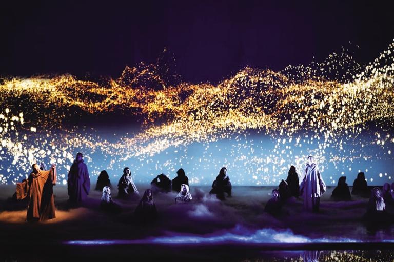音樂劇《飛天》以堅(jiān)守大漠的敦煌守護(hù)者為原型,講述了一個動人的敦煌故事:在大漠戈壁,畫匠女兒為完成父親保護(hù)壁畫的遺愿,像“守護(hù)人”一般,以單薄之軀始終堅(jiān)守,守護(hù)莫高窟;在法國巴黎,一位年輕人因意外看到敦煌壁畫畫冊,如“趕路人”一樣,一路顛沛流離,最終抵達(dá)敦煌,守護(hù)敦煌;飽受自然侵蝕等病痛折磨的“飛天夫妻”,從莫高窟壁畫中“走”出來,對“趕路人”為壁畫“治病施診”抱有莫大期望,一路伴隨“趕路人”回到敦煌。“守護(hù)人”與“趕路人”一靜一動,身處不同地理坐標(biāo),卻總在某個瞬間同時進(jìn)入壁畫幻象之中,并在夢里完成對敦煌壁畫本生故事的演繹,最終合二為一,化身為真正的“飛天”。