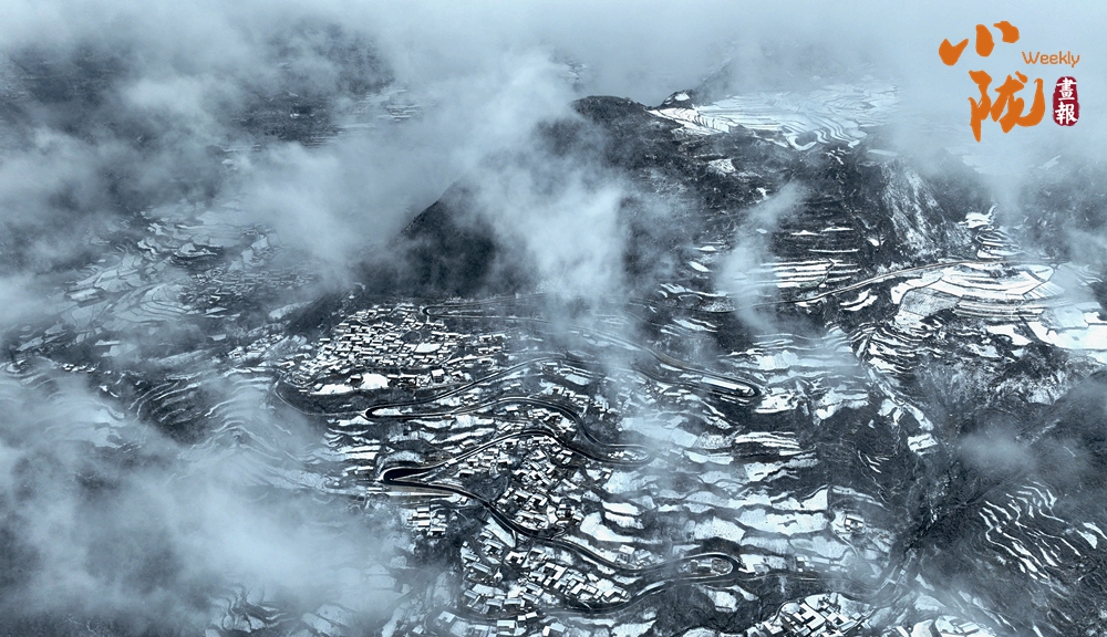 雪后梯田云遮霧蓋,黑白分明的線條優(yōu)雅而生動,展現出別樣的韻味。