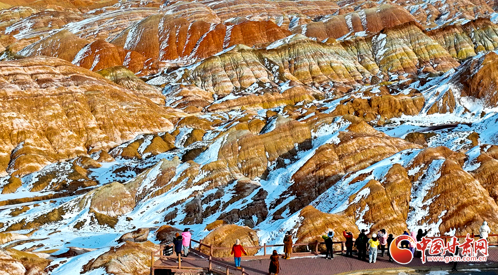 春節(jié)假期,張掖市七彩丹霞景區(qū)內(nèi)人頭攢動,全國各地游客慕名而來,欣賞宛如夢幻仙境般的雪浴丹霞地貌景觀,在領(lǐng)略大西北壯美景色中歡歡喜喜過大年。