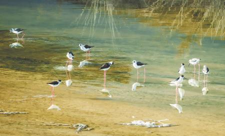 4月9日,一群黑翅長腳鷸在定西湖水面飛行。進入4月,候鳥陸續(xù)北遷,定西湖成了眾多鳥群遷徙途中的歇腳補給地。新定西·定西日報記者 牛小棟 攝