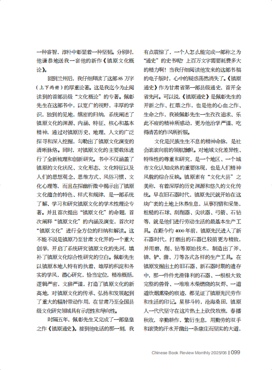 回到蘭州后,我仔細(xì)拜讀了這部85萬字(上下兩冊(cè))的厚重論著。這是我迄今為止閱讀到的首部縣級(jí)“文化概論”的專著。佩彰先生在這部書中,以寬廣的視野,豐厚的學(xué)識(shí),獨(dú)到的見地,縝密的歸納,系統(tǒng)闡述了鎮(zhèn)原文化的淵源、內(nèi)涵、特征、核心和基本精神,通過對(duì)鎮(zhèn)原歷史、地理、人文的廣泛探尋和深入挖掘,勾勒出了鎮(zhèn)原文化演變的清晰脈絡(luò)。同時(shí),對(duì)鎮(zhèn)原文化的主要載體進(jìn)行了全新梳理和創(chuàng)新研究。書中不僅涵蓋了鎮(zhèn)原的文化狀況、文化形態(tài)、文化特征以及人們的思想觀念、思維方式、風(fēng)俗習(xí)慣、文化心理等,而且在探幽析微中揭示出了鎮(zhèn)原文化蘊(yùn)含的特色、樣式和規(guī)律,是一部系統(tǒng)了解、學(xué)習(xí)和研究鎮(zhèn)原文化的學(xué)術(shù)性理論專著。并且首次提出“鎮(zhèn)原文化”的命題,首次闡釋“鎮(zhèn)原文化”的內(nèi)涵及演變,首次對(duì)“鎮(zhèn)原文化”進(jìn)行全方位的歸納和解讀。這不能不說是鎮(zhèn)原乃至甘肅文化界的一個(gè)重大創(chuàng)舉,開啟了系統(tǒng)研究鎮(zhèn)原文化的先河,填補(bǔ)了鎮(zhèn)原文化綜合性研究的空白。佩彰先生以鎮(zhèn)原本地人特有的執(zhí)著、雄厚的積淀和務(wù)實(shí)的學(xué)風(fēng),潛心研究,恰當(dāng)定位,精準(zhǔn)概括,邏輯嚴(yán)密,文辭嚴(yán)謹(jǐn),打造了鎮(zhèn)原文化的新高地,對(duì)鎮(zhèn)原文化的傳承、弘揚(yáng)和發(fā)展起到了重大的輻射帶動(dòng)作用,在甘肅乃至全國(guó)縣級(jí)文化研究領(lǐng)域具有示范性和導(dǎo)向性。