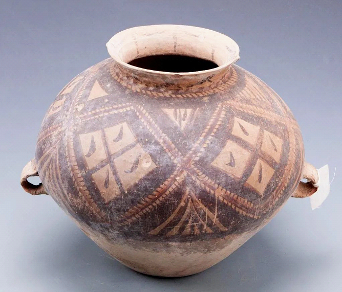 菱格紋是馬家窯文化半山類型彩陶的核心紋飾,由連續(xù)排列的菱形格構(gòu)成,常見于壺、罐等器物的上腹部。該紋飾流行于公元前2650-2350年的馬家窯文化中期,典型器型如甘肅省廣河縣半山遺址出土的菱格紋彩陶雙耳罐。早期以大面積菱格為主體,晚期演變?yōu)樘畛渚W(wǎng)格或涂黑的輔助紋飾,至馬廠時(shí)期發(fā)展為四大圓圈紋內(nèi)裝飾。