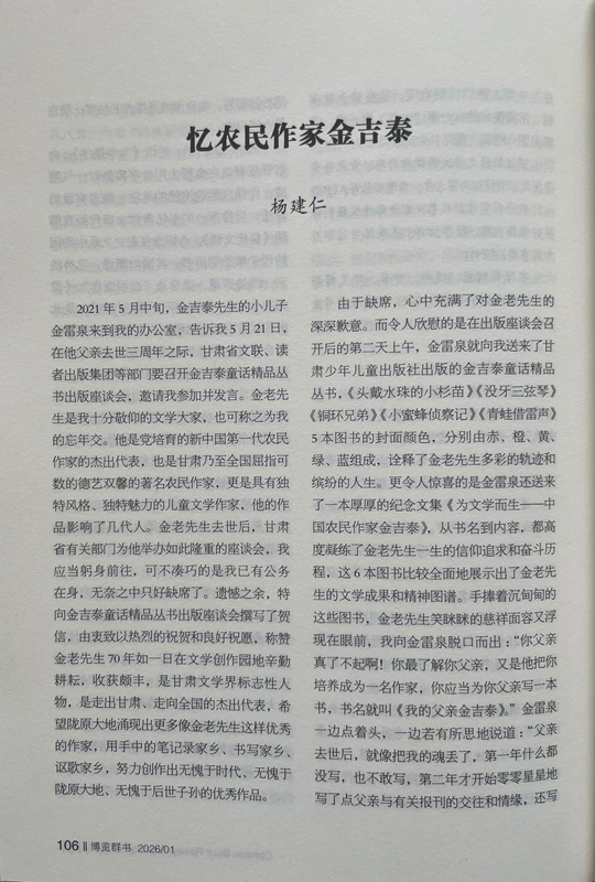 由于缺席,心中充滿(mǎn)了對(duì)金老先生的深深歉意。而令人欣慰的是在出版座談會(huì)召開(kāi)后的第二天上午,金雷泉就向我送來(lái)了甘肅少年兒童出版社出版的金吉泰童話(huà)精品叢書(shū),《頭戴水珠的小杉苗》《沒(méi)牙三弦琴》《銅環(huán)兄弟》《小蜜蜂偵察記》《青蛙借雷聲》5本圖書(shū)的封面顏色,分別由赤、橙、黃、綠、藍(lán)組成,詮釋了金老先生多彩的軌跡和繽紛的人生。更令人驚喜的是金雷泉還送來(lái)了一本厚厚的紀(jì)念文集《為文學(xué)而生——中國(guó)農(nóng)民作家金吉泰》,從書(shū)名到內(nèi)容,都高度凝練了金老先生一生的信仰追求和奮斗歷程,這6本圖書(shū)比較全面地展示出了金老先生的文學(xué)成果和精神圖譜。手捧著沉甸甸的這些圖書(shū),金老先生笑瞇瞇的慈祥面容又浮現(xiàn)在眼前,我向金雷泉脫口而出:“你父親真了不起?。∧阕盍私饽愀赣H,又是他把你培養(yǎng)成為一名作家,你應(yīng)當(dāng)為你父親寫(xiě)一本書(shū),書(shū)名就叫《我的父親金吉泰》。”金雷泉一邊點(diǎn)著頭,一邊若有所思地說(shuō)道:“父親去世后,就像把我的魂丟了,第一年什么都沒(méi)寫(xiě),也不敢寫(xiě),第二年才開(kāi)始零零星星地寫(xiě)了點(diǎn)父親與有關(guān)報(bào)刊的交往和情緣,還寫(xiě)了點(diǎn)父親在生活和寫(xiě)作中的軼事趣聞。您的建議非常好,我擔(dān)心駕馭不好,試試看吧。”我感覺(jué)金雷泉有點(diǎn)為難,馬上又安慰他:“不急,你用兩三年時(shí)間慢慢寫(xiě)。”