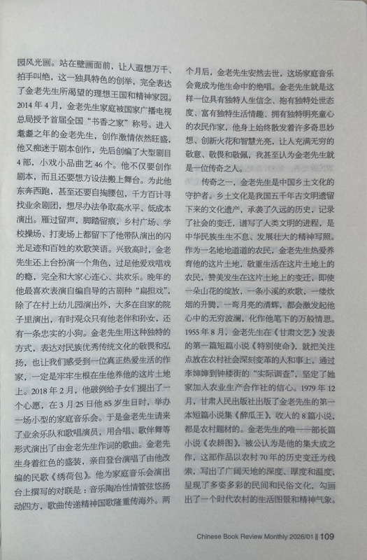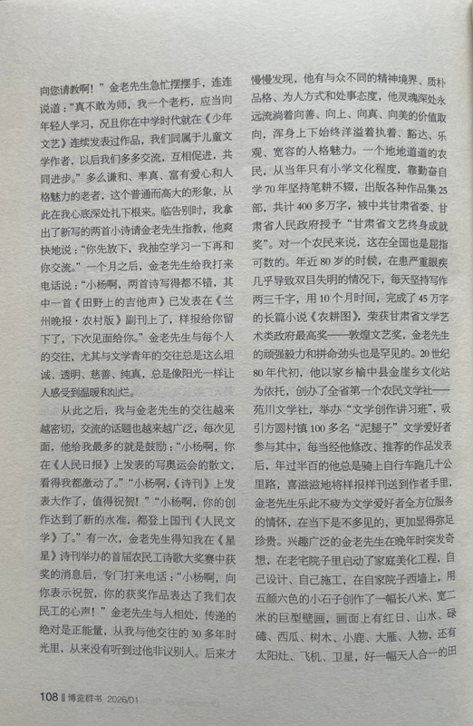 從此之后,我與金老先生的交往越來(lái)越密切,交流的話(huà)題也越來(lái)越廣泛,每次見(jiàn)面,他給我最多的就是鼓勵(lì):“小楊啊,你在《人民日?qǐng)?bào)》上發(fā)表的寫(xiě)奧運(yùn)會(huì)的散文,看得我都激動(dòng)了。”“小楊啊,《詩(shī)刊》上發(fā)表大作了,值得祝賀!”“小楊啊,你的創(chuàng)作達(dá)到了新的水準(zhǔn),都登上國(guó)刊《人民文學(xué)》了。”有一次,金老先生得知我在《星星》詩(shī)刊舉辦的首屆農(nóng)民工詩(shī)歌大獎(jiǎng)賽中獲獎(jiǎng)的消息后,專(zhuān)門(mén)打來(lái)電話(huà):“小楊啊,向你表示祝賀,你的獲獎(jiǎng)作品表達(dá)了我們農(nóng)民工的心聲!”金老先生與人相處,傳遞的絕對(duì)是正能量,從我與他交往的30多年時(shí)光里,從來(lái)沒(méi)有聽(tīng)到過(guò)他非議別人。后來(lái)才慢慢發(fā)現(xiàn),他有與眾不同的精神境界、質(zhì)樸品格、為人方式和處事態(tài)度,他靈魂深處永遠(yuǎn)流淌著向善、向上、向真、向美的價(jià)值取向,渾身上下始終洋溢著執(zhí)著、豁達(dá)、樂(lè)觀、寬容的人格魅力。一個(gè)地地道道的農(nóng)民,從當(dāng)年只有小學(xué)文化程度,靠勤奮自學(xué)70年堅(jiān)持筆耕不輟,出版各種作品集25部,共計(jì)400多萬(wàn)字,被中共甘肅省委、甘肅省人民政府授予“甘肅省文藝終身成就獎(jiǎng)”。對(duì)一個(gè)農(nóng)民來(lái)說(shuō),這在全國(guó)也是屈指可數(shù)的。年近80歲的時(shí)候,在患嚴(yán)重眼疾幾乎導(dǎo)致雙目失明的情況下,每天堅(jiān)持寫(xiě)作兩三千字,用10個(gè)月時(shí)間,完成了45萬(wàn)字的長(zhǎng)篇小說(shuō)《農(nóng)耕圖》,榮獲甘肅省文學(xué)藝術(shù)類(lèi)政府最高獎(jiǎng)——敦煌文藝獎(jiǎng),金老先生的頑強(qiáng)毅力和拼命勁頭也是罕見(jiàn)的。20世紀(jì)80年代初,他以家鄉(xiāng)榆中縣金崖鄉(xiāng)文化站為依托,創(chuàng)辦了全省第一個(gè)農(nóng)民文學(xué)社——苑川文學(xué)社,舉辦“文學(xué)創(chuàng)作講習(xí)班”,吸引方圓村鎮(zhèn)100多名“泥腿子”文學(xué)愛(ài)好者參與其中,每當(dāng)經(jīng)他修改、推薦的作品發(fā)表后,年過(guò)半百的他總是騎上自行車(chē)跑幾十公里路,喜滋滋地將樣報(bào)樣刊送到作者手里,金老先生樂(lè)此不疲為文學(xué)愛(ài)好者全方位服務(wù)的情懷,在當(dāng)下是不多見(jiàn)的,更加顯得彌足珍貴。興趣廣泛的金老先生在晚年時(shí)突發(fā)奇想,在老宅院子里啟動(dòng)了家庭美化工程,自己設(shè)計(jì)、自己施工,在自家院子西墻上,用五顏六色的小石子創(chuàng)作了一幅長(zhǎng)八米、寬二米的巨型壁畫(huà),畫(huà)面上有紅日、山水、碌碡、西瓜、樹(shù)木、小鹿、大雁、人物,還有太陽(yáng)灶、飛機(jī)、衛(wèi)星,好一幅天人合一的田園風(fēng)光畫(huà)。站在壁畫(huà)面前,讓人遐想萬(wàn)千、拍手叫絕,這一獨(dú)具特色的創(chuàng)舉,完全表達(dá)了金老先生所渴望的理想王國(guó)和精神家園。2014年4月,金老先生家庭被國(guó)家廣播電視總局授予首屆全國(guó)“書(shū)香之家”稱(chēng)號(hào)。進(jìn)入耄耋之年的金老先生,創(chuàng)作激情依然旺盛,他又癡迷于劇本創(chuàng)作,先后創(chuàng)編了大型劇目4部,小戲小品曲藝46個(gè)。他不僅要?jiǎng)?chuàng)作劇本,而且還要想方設(shè)法搬上舞臺(tái)。為此他東奔西跑,甚至還要自掏腰包,千方百計(jì)尋找業(yè)余劇團(tuán),想盡辦法爭(zhēng)取高水平、低成本演出。雁過(guò)留聲,腳踏留痕,鄉(xiāng)村廣場(chǎng)、學(xué)校操場(chǎng)、打麥場(chǎng)上都留下了他帶隊(duì)演出的閃光足跡和百姓的歡歌笑語(yǔ)。興致高時(shí),金老先生還上臺(tái)扮演一個(gè)角色,過(guò)足他愛(ài)戲唱戲的癮,完全和大家心連心、共歡樂(lè)。晚年的他最喜歡表演自編自導(dǎo)的古劇種“扁擔(dān)戲”,除了在村上幼兒園演出外,大多在自家的院子里演出,有時(shí)觀眾只有他老伴和孫女,還有一條忠實(shí)的小狗。金老先生用這種獨(dú)特的方式,表達(dá)對(duì)民族優(yōu)秀傳統(tǒng)文化的敬畏和弘揚(yáng),也讓我們感受到一位真正熱愛(ài)生活的作家,一定是牢牢生根在生他養(yǎng)他的這片土地上。2018年2月,他破例給子女們提出了一個(gè)心愿,在3月25日他85歲生日時(shí),舉辦一場(chǎng)小型的家庭音樂(lè)會(huì)。于是金老先生請(qǐng)來(lái)了業(yè)余樂(lè)隊(duì)和歌唱演員,用合唱、歌伴舞等形式演出了由金老先生作詞的歌曲。金老先生身著紅色的盛裝,親自登臺(tái)演唱了由他改編的民歌《繡荷包》。他為家庭音樂(lè)會(huì)演出臺(tái)上撰寫(xiě)的對(duì)聯(lián)是:音樂(lè)陶冶性情管弦悠揚(yáng)動(dòng)四方,歌曲傳遞精神國(guó)歌隆重傳海外。兩個(gè)月后,金老先生安然去世,這場(chǎng)家庭音樂(lè)會(huì)竟成為他生命中的絕唱。金老先生就是這樣一位具有獨(dú)特人生信念、抱有獨(dú)特處世態(tài)度、富有獨(dú)特生活情趣、擁有獨(dú)特明亮童心的農(nóng)民作家,他身上始終散發(fā)著許多奇思妙想、創(chuàng)新火花和智慧光亮,讓人充滿(mǎn)無(wú)窮的敬意、敬畏和敬佩,我甚至認(rèn)為金老先生就是一位傳奇之人。