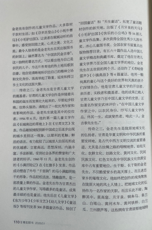 傳奇之二,金老先生是甘肅兒童文學(xué)的奠基者。甘肅的兒童文學(xué)創(chuàng)作是伴隨著共和國(guó)的誕生而發(fā)展壯大起來(lái)的,盡管起步較晚,但勢(shì)頭強(qiáng)勁,涌現(xiàn)出了一批優(yōu)秀作家和有影響的作品,金老先生就是其中的佼佼者。1956年6月,他的第一篇兒童文學(xué)作品《長(zhǎng)城南邊的草地上》在《甘肅文藝》發(fā)表,作品敏銳捕捉到新中國(guó)成立后逐步出現(xiàn)的城鄉(xiāng)差別這一現(xiàn)象,以犀利的筆觸、鮮活的語(yǔ)言,有力批駁了以城里人自居而形成的優(yōu)越感,立意高遠(yuǎn),思想深刻,內(nèi)涵豐富,手法新穎,受到社會(huì)各界的贊譽(yù)和廣大讀者的好評(píng)。1960年11月,金老先生創(chuàng)作的《小滿(mǎn)歷險(xiǎn)記》在《紅旗手》發(fā)表,作品成功塑造了外號(hào)“千里駒”的馬小滿(mǎn)聰明能干的形象,作品輕松活潑,情趣盎然,是一部質(zhì)量上乘的作品。金老先生作為甘肅杰出的兒童文學(xué)作家,寫(xiě)得最多的是童話(huà),成果最豐碩的也是童話(huà)。他先后在《兒童文學(xué)》《東方少年》《少年文藝》《幼兒文學(xué)》《童話(huà)報(bào)》等報(bào)刊發(fā)表300多篇童話(huà)作品,獨(dú)創(chuàng)了“田園童話(huà)”和“天生童話(huà)”,拓寬了童話(huà)題材創(chuàng)作的新天地,出版了《月牙泉的天馬》《小毛驢出國(guó)》《快樂(lè)的小公雞》等16部?jī)和膶W(xué)作品集,多次獲得全國(guó)優(yōu)秀少兒圖書(shū)獎(jiǎng)、冰心兒童圖書(shū)獎(jiǎng)、全國(guó)農(nóng)家書(shū)屋重點(diǎn)出版物推薦目錄,有五六十篇作品入選中國(guó)兒童文學(xué)精選和典藏書(shū)庫(kù),奠定了他在甘肅兒童文學(xué)界乃至全國(guó)兒童文學(xué)界的地位。金老先生在去世前的兩個(gè)月,還創(chuàng)作了《青蛙借雷聲》《小鎮(zhèn)典故》等6篇童話(huà),他用一顆純真的童心與這個(gè)美好的世界和天真的孩子們深情告白。他是甘肅兒童文學(xué)的開(kāi)創(chuàng)者、親歷者、實(shí)踐者和奠基者,他的成果已載入甘肅兒童文學(xué)乃至中國(guó)兒童文學(xué)的史冊(cè),正如著名作家安武林評(píng)價(jià):“在中國(guó)兒童文學(xué)作家之中,以農(nóng)民身份,抒寫(xiě)兒童文學(xué)作品,終其一生,成就斐然者,唯此一人,金吉泰先生也。”