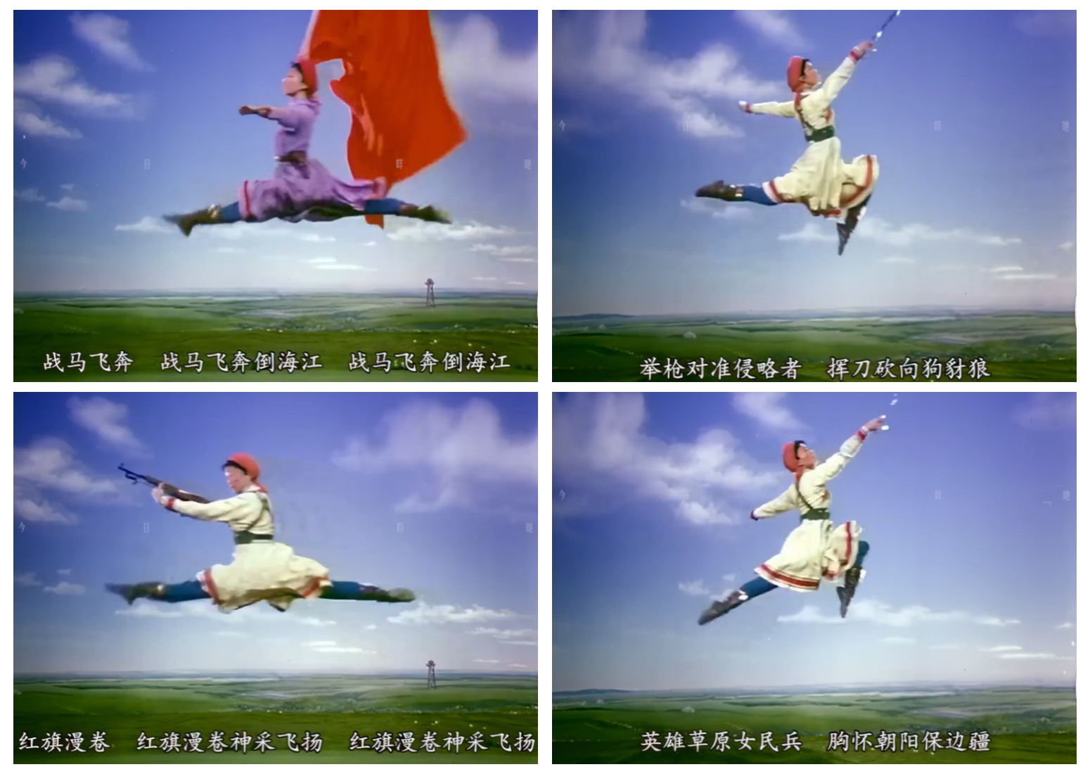 《草原女民兵》最初作為舞臺舞蹈,其美學(xué)特質(zhì)建立在現(xiàn)場性、即時性與三維空間性之上。而當(dāng)它通過《百花爭艷》的鏡頭被重新詮釋時,經(jīng)歷了一場深刻的美學(xué)轉(zhuǎn)換。電影不僅記錄了這一舞蹈,更通過其特有的語言系統(tǒng),對舞蹈進行了二次創(chuàng)作與美學(xué)升華。