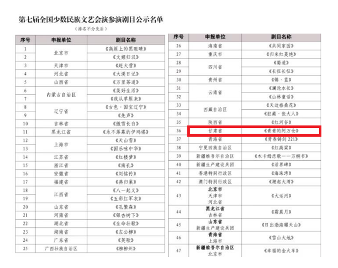 近日,國家民委正式發(fā)布《第七屆全國少數(shù)民族文藝會演參演劇目公示名單》。經(jīng)嚴(yán)格遴選與層層審核,由甘肅省委宣傳部、省委統(tǒng)戰(zhàn)部指導(dǎo),省民委、省文旅廳、省文聯(lián)、省衛(wèi)健委、甘肅演藝集團(tuán)聯(lián)合出品,甘肅省話劇院傾力創(chuàng)排演出的話劇《青青的阿萬倉》成功入圍。