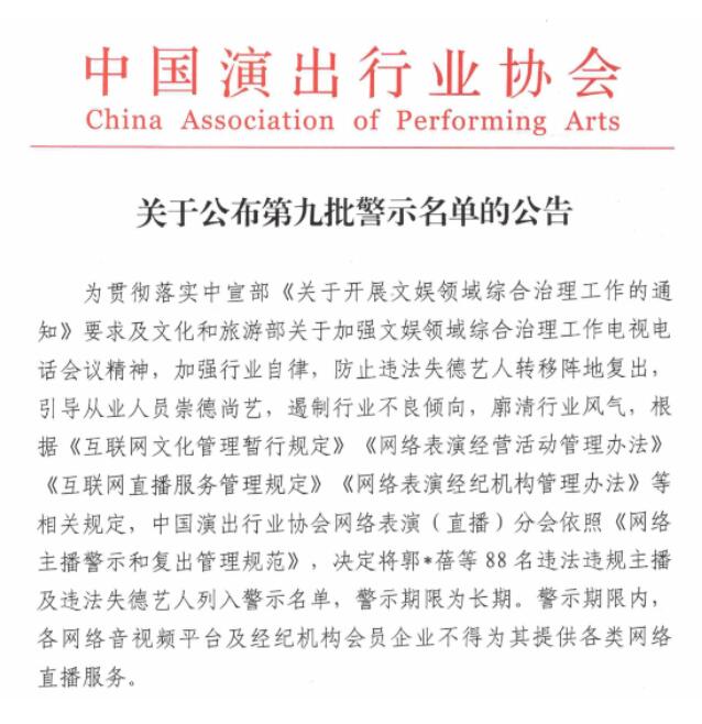 中國演出行業(yè)協(xié)會網(wǎng)絡(luò)表演(直播)分會近日發(fā)布了第九批網(wǎng)絡(luò)主播警示名單,包括“鐵山靠”“郭老師”兩名職業(yè)主播和“吳亦凡”“鄭爽”“張哲瀚”三名演員在內(nèi)的88名主播將在行業(yè)內(nèi)被實行聯(lián)合抵制和懲戒。這是違法失德藝人首次被納入網(wǎng)絡(luò)主播警示名單中,防止劣跡藝人轉(zhuǎn)移陣地復出。