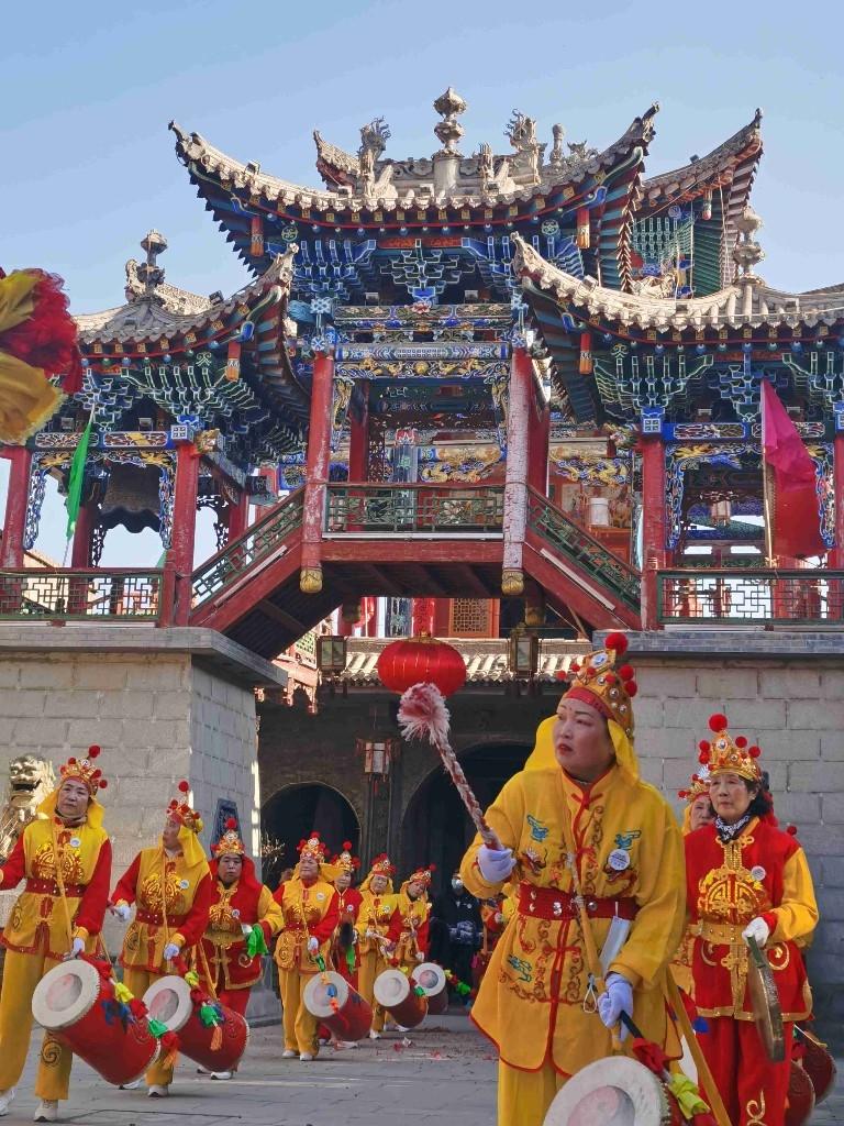 在社火展演現(xiàn)場,人員身穿鮮艷亮麗的服飾,伴隨著鏗鏘歡快的鼓點,以飽滿的激情展示了源遠流長的民間社火藝術(shù),為群眾送來了虎年的祝福。