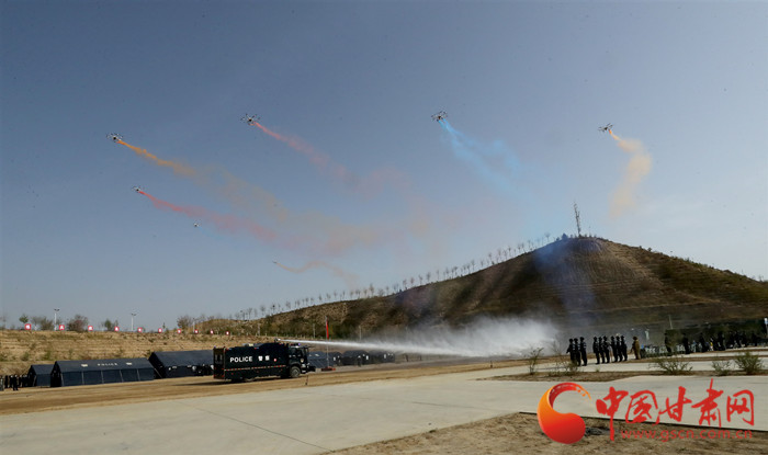 劈、掃、挑、砸,由甘肅警察職業(yè)學院1500名學警組建的應(yīng)急處突預備隊規(guī)范的擒拿動作一氣呵成。