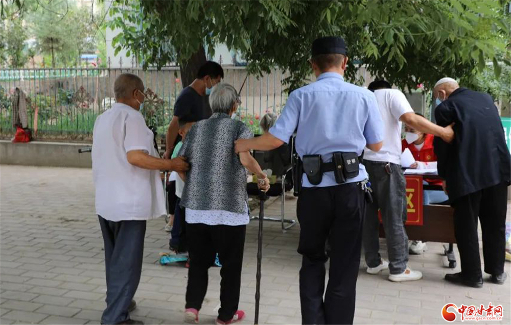 紅古分局海石灣派出所民警在核酸采樣點(diǎn)主動(dòng)攙扶行動(dòng)不便的老人進(jìn)行核酸采樣。紅古分局 張 鼎/攝
