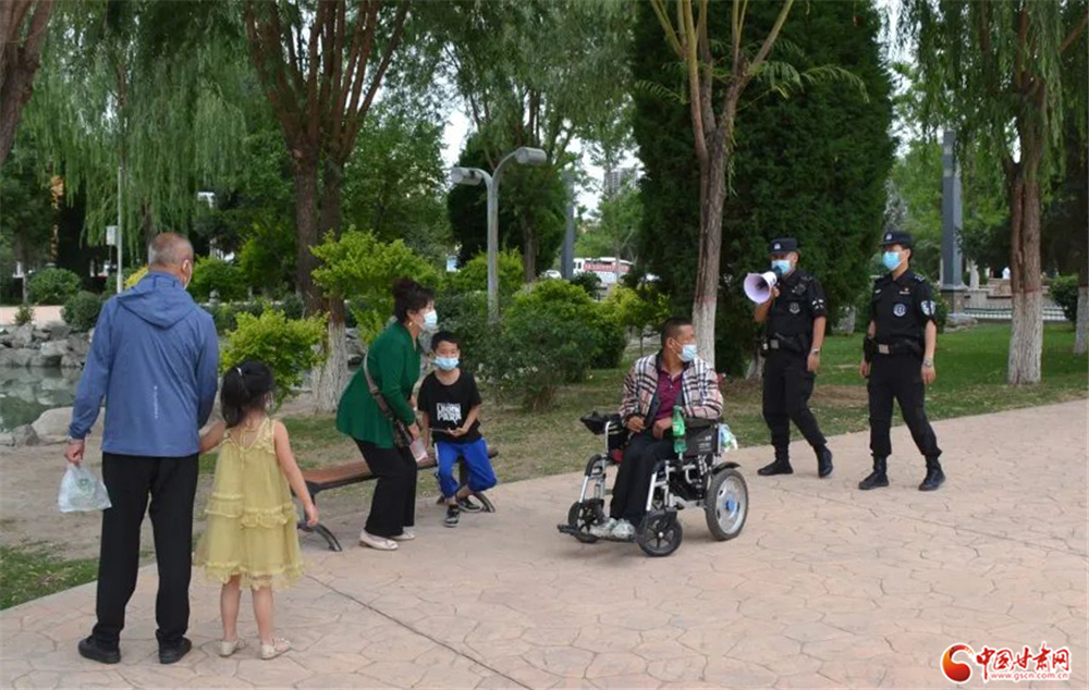 永登公安巡邏特警隊(duì)員在公園等公共場(chǎng)所手持小喇叭勸導(dǎo)群眾戴口罩少聚集不出門。永登縣局 徐大明/攝