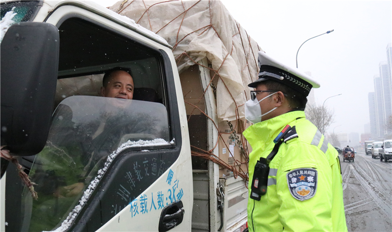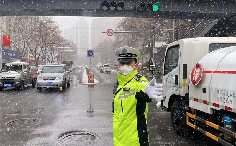 大隊領(lǐng)導(dǎo)實地查看道路通行情況,及時調(diào)整勤務(wù)模式和警力部署,確保降雪天氣各項安全“防控”措施落實到位。民輔警全員上路,強化重點路段巡邏管控和主要路口值守,對不具備通行條件車輛進行勸返或提示繞行。通過鳴笛、喊話、閃爍警燈等措施,提醒駕駛員裝配防滑鏈,減緩車速、保持安全車距、注意觀察路面通行情況,引導(dǎo)車輛和行人安全有序通行。