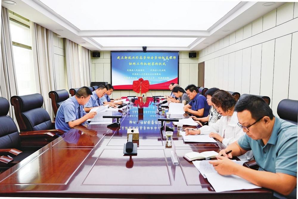 民勤縣檢察院邀請(qǐng)法院、人社、司法、工會(huì)、婦聯(lián)等部門單位召開座談會(huì),共同簽訂《關(guān)于建立新就業(yè)形態(tài)勞動(dòng)者勞動(dòng)權(quán)益保障協(xié)同工作機(jī)制的意見》(2024年6月7日拍攝)。