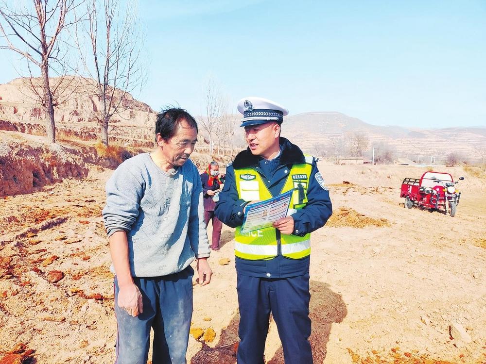民警向群眾講解法律法規(guī)。3月10日,隴西縣公安局渭陽派出所民警深入田間地頭,開展道路交通安全和反電詐宣傳?! ⌒赂拭C·甘肅法治報通訊員劉榮攝