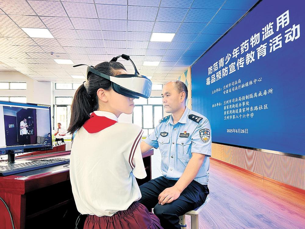 2025年6月26日,蘭州市司法局強制隔離戒毒所干警走進蘭州市第八十六中學開展禁毒宣傳教育。圖為學生佩戴VR眼鏡,通過虛擬現(xiàn)實技術(shù)創(chuàng)造逼真的沾染毒品場景,讓學生身臨其境地感受毒品的危害。