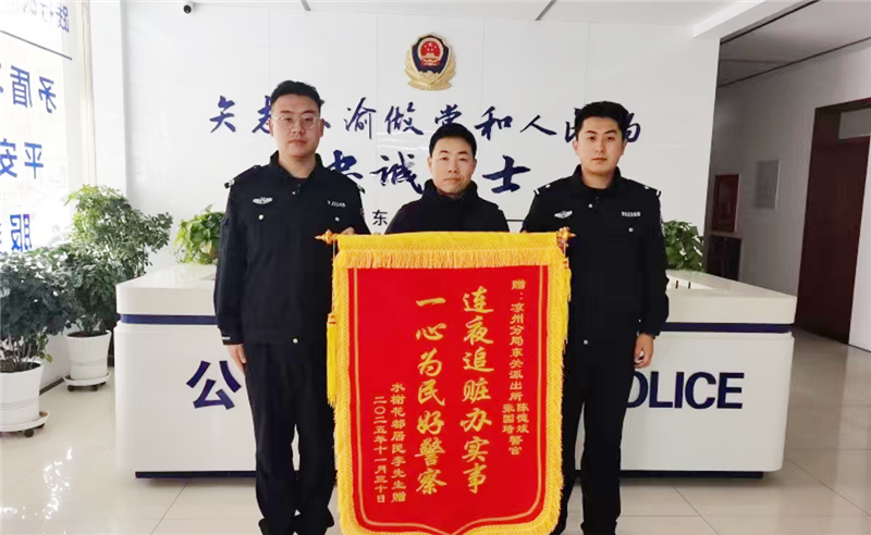 拿到失而復(fù)得的手機(jī),李先生激動(dòng)不已:“真沒想到你們能連夜幫我找回來,你們太負(fù)責(zé)任了!”隨后,他也送來一面寫有“連夜追贓辦實(shí)事,一心為民好警察”的錦旗,向民輔警的盡心盡責(zé)表達(dá)感謝。