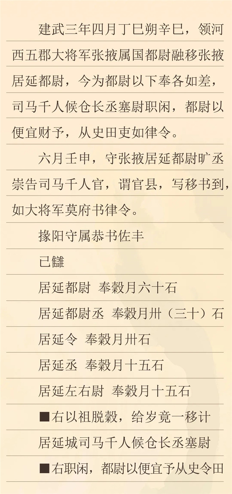這封冊書記載了建武三年,竇融管轄河西時發(fā)布的一條關(guān)于都尉以下官吏奉谷等差的命令。根據(jù)竇融發(fā)布的新規(guī)定,我們可以看到,秩比二千石的居延都尉月奉谷僅為六十石,史書有“十斗一斛”及“十斗一石”的記載,此六十石即是六十斛,相比于史書記載中比二千石每月百斛的俸例要少,而其余官吏的俸祿也相應(yīng)要少,雖然漢代不同時期的官吏俸祿存在變化,但對比所見的這種情況,可能也跟兩漢之交戰(zhàn)亂頻仍的社會環(huán)境有重要關(guān)系。(李晶整理)