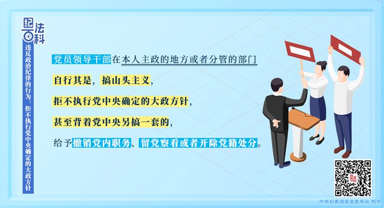 《中國共產(chǎn)黨紀(jì)律處分條例》第五十六條第一款規(guī)定,黨員領(lǐng)導(dǎo)干部在本人主政的地方或者分管的部門自行其是,搞山頭主義,拒不執(zhí)行黨中央確定的大政方針,甚至背著黨中央另搞一套的,給予撤銷黨內(nèi)職務(wù)、留黨察看或者開除黨籍處分。