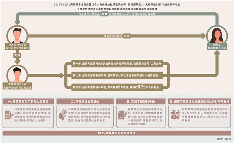 貪污罪。2017年10月,林某某妻子陶某某(無(wú)業(yè),另案處理)考慮到自己以個(gè)人身份繳納社保已滿15年,而按照規(guī)定,個(gè)人參保在55歲才能領(lǐng)取養(yǎng)老金,于是便想掛靠企業(yè)單位參保,以便能在50歲辦理退休、提前享受退休待遇?;诖?,陶某某便與林某某商量能否掛靠B縣農(nóng)業(yè)開(kāi)發(fā)公司提前辦理退休,林某某聽(tīng)后表示同意,并利用擔(dān)任該公司董事長(zhǎng)的職務(wù)便利,在明知陶某某不符合提前退休條件的情況下,安排時(shí)任公司辦公室主任李某某(另案處理)虛構(gòu)勞動(dòng)關(guān)系,為陶某某以該公司職工身份辦理退休事宜。手續(xù)辦理過(guò)程中,李某某按林某某的安排,偽造B縣農(nóng)業(yè)開(kāi)發(fā)公司與陶某某的《勞動(dòng)合同書》,經(jīng)林某某本人簽字后加蓋公司合同專用章,陶某某憑該合同在B縣人力資源和社會(huì)保障局進(jìn)行勞動(dòng)合同鑒證。完成鑒證后,陶某某順利以B縣農(nóng)業(yè)開(kāi)發(fā)公司職工身份參保,當(dāng)年度公司為其繳納職工養(yǎng)老保險(xiǎn)、工傷保險(xiǎn)、失業(yè)保險(xiǎn)、醫(yī)療保險(xiǎn)共計(jì)7649.76元。其間,陶某某從未在B縣農(nóng)業(yè)開(kāi)發(fā)公司上班,也未向公司補(bǔ)繳為其繳納的社保費(fèi)用。