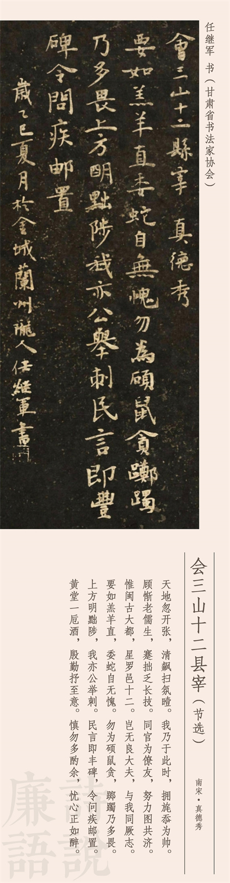 公元1232年,南宋官員真德秀到福州擔任知府,到任后把下轄12個縣的知縣召集在一起集體談話,擺事實、講道理,談廉政、申紀律,事后將談話內(nèi)容寫成了詩,就是今天我們看到的這首作品。這是一首五言敘事詩,長達250字,這里我們節(jié)選后半部分。