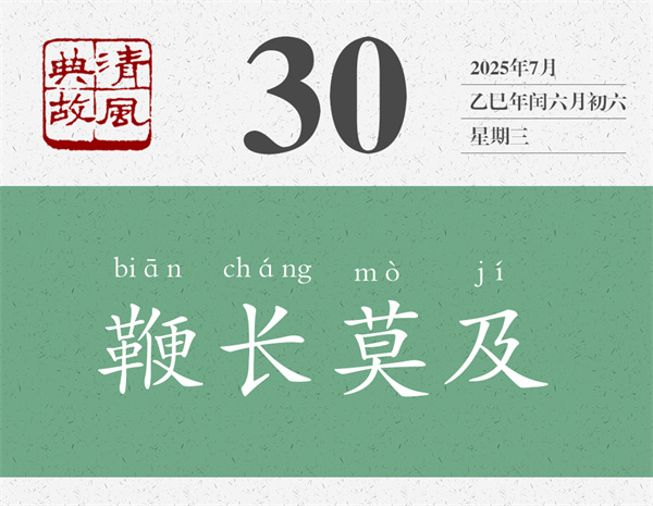 先古語,后民諺,伯宗的一番高能輸出,晉景公全無招架之功,只好打消了出兵救宋的念頭。“雖鞭之長(zhǎng),不及馬腹”的意思是,鞭子再長(zhǎng),也不能打在馬肚子上。不是因?yàn)楸拮佑|及不到馬肚子,而是因?yàn)轳R肚子不是鞭子該打的地方。后世則以“鞭長(zhǎng)莫及”為典,說明鞭子雖然長(zhǎng),但還是打不到想打的地方,比喻因?yàn)榫嚯x太遠(yuǎn),而無能為力,或者因?yàn)閷?shí)力不足,不能想得太遠(yuǎn)。