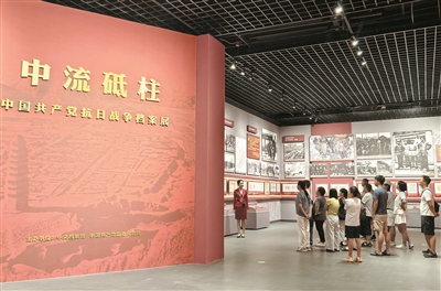 走進中國共產(chǎn)黨歷史展覽館四層專題展廳,首先看到一面紅底金字的大型展板,形似一本翻開的書本。“書”的正面,“中流砥柱”四個大字在燈光照射下閃閃發(fā)亮,下方緊跟一行小字“中國共產(chǎn)黨抗日戰(zhàn)爭檔案展”;側(cè)面,金色字體展示著毛澤東同志《中國共產(chǎn)黨在民族戰(zhàn)爭中的地位》里的內(nèi)容:“每一個共產(chǎn)黨員必須發(fā)揮其全部的積極性,英勇堅決地走上民族解放戰(zhàn)爭的戰(zhàn)場,拿槍口瞄準日本侵略者。”